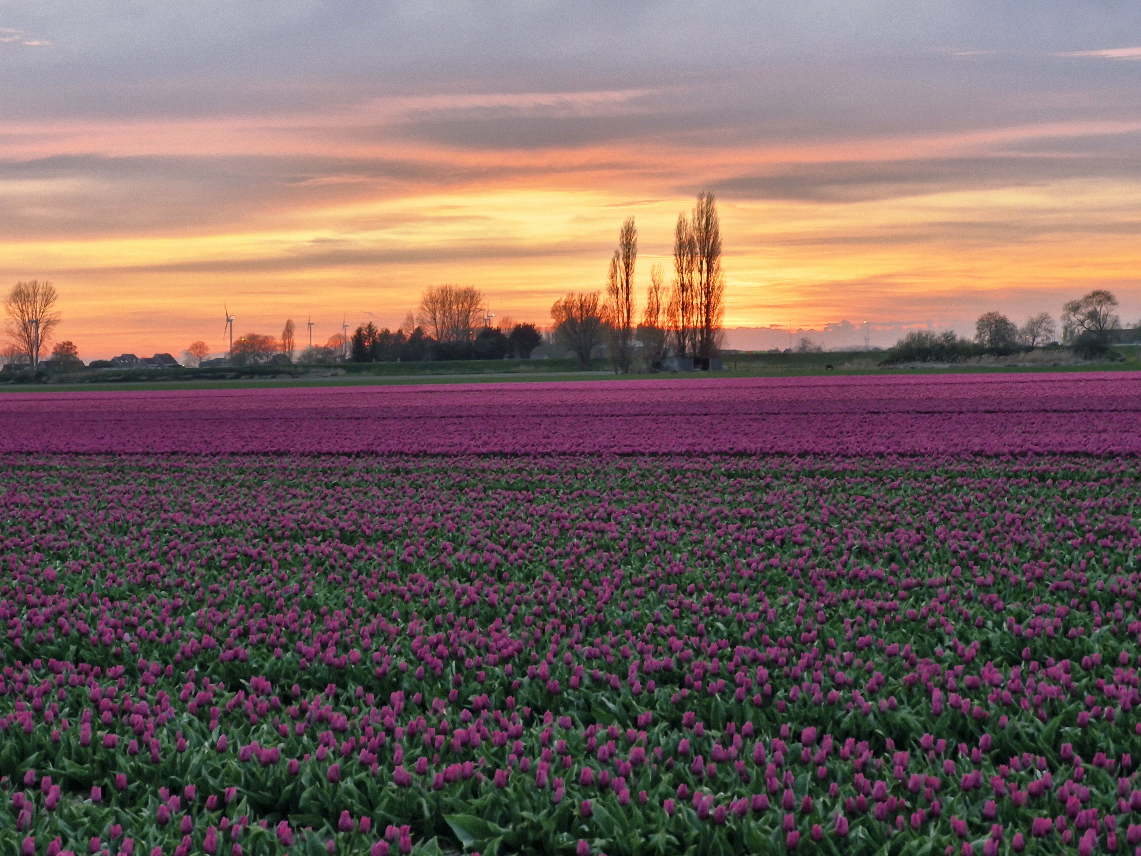 Mooi Fijnaart met de paarse tulpenvelden en zonsondergang