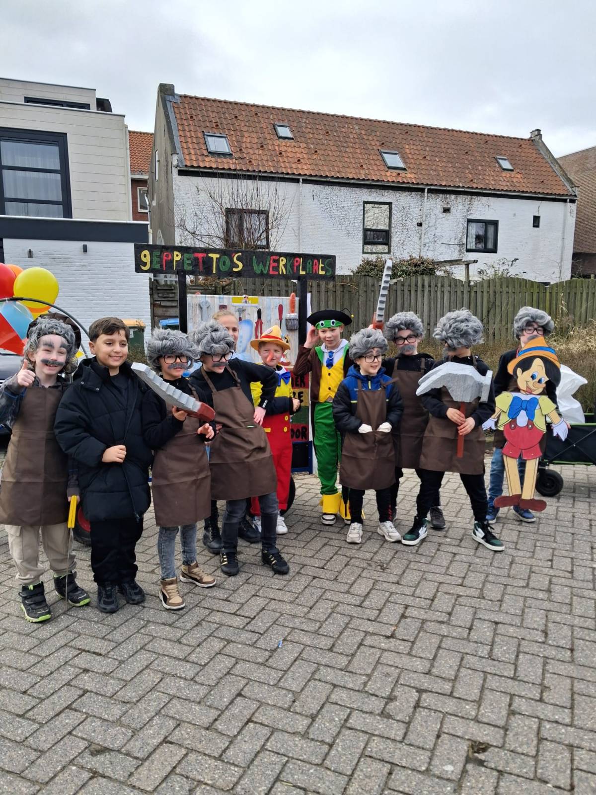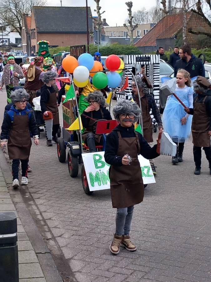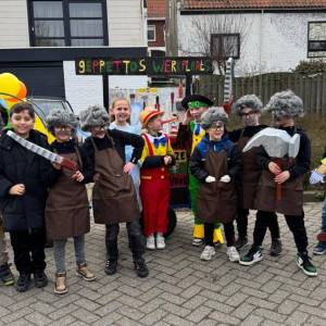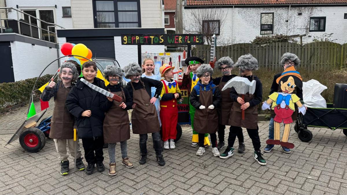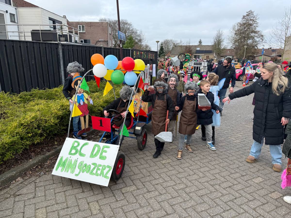De enthousiaste groep – bestaande uit tien jongens en één meisje uit groep 5 van Basisschool De Fijne Aarde – liep dit jaar voor het eerst mee met de scholenoptocht. Onder de naam BC de Mini Goozers maakten zij meteen indruk met hun thema: Gepetto’s werkplaats.
