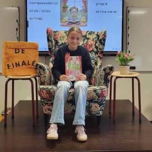 Dané kwam als vierde op de mooie voorleesstoel. Zij las voor uit het boek ‘Vals’ van Carry Slee. Over Kay die een vreselijk valse juf heeft, die het liefst kinderen de stuipen op het lijf jaagt. Dané las het vol emotie voor, met duidelijke stem en contact met haar publiek.